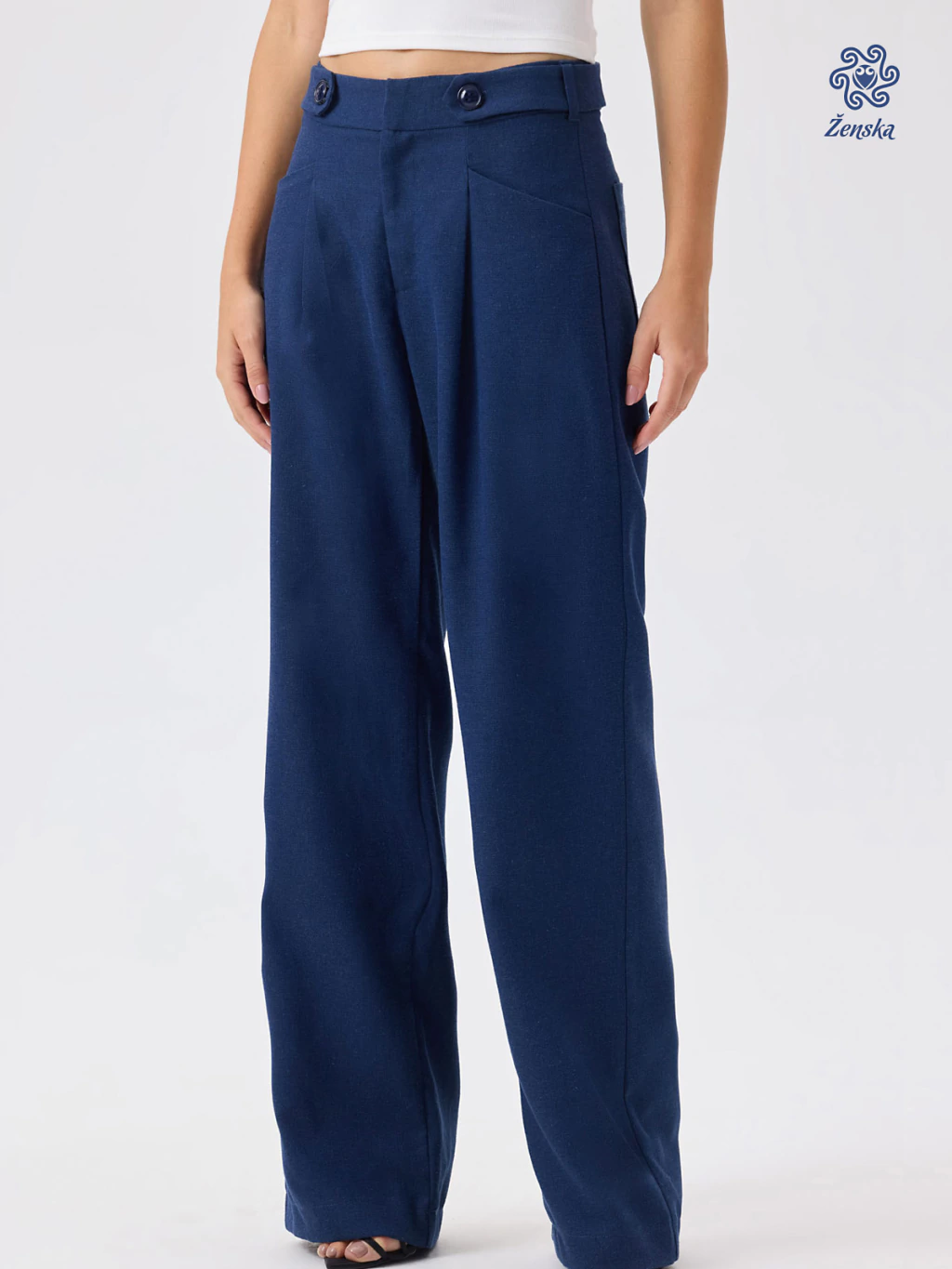 Calça wide leg em linho, azul, com bolsos funcionais laterais e traseiros. Conforto e estilo para looks casuais e elegantes. Peça versátil e leve para seu dia a dia.